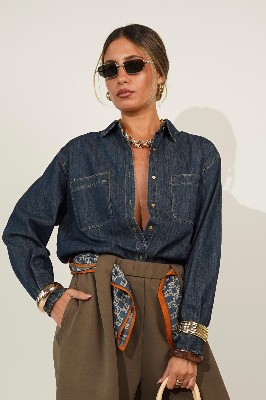 חולצת ג׳ינס מכופתרת לנשים - דגם מילה בצבעים ג׳ינס כהה וכחול ג׳ינס