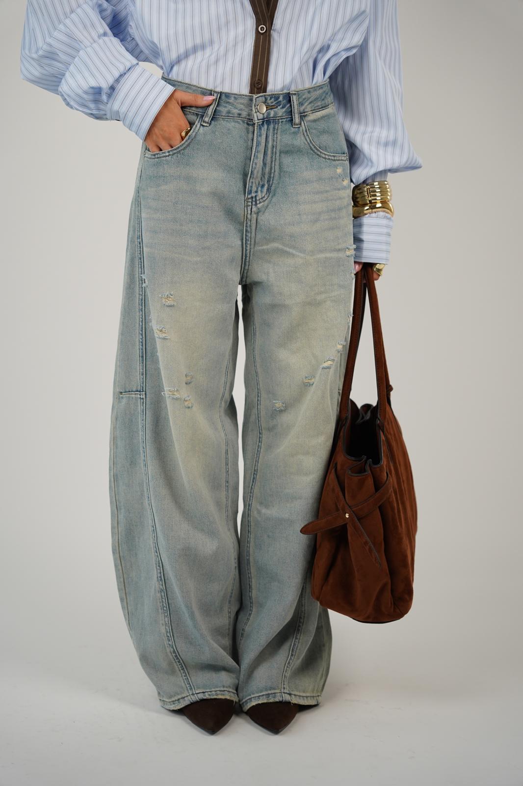 ג׳ינס משופשף עם סיומת רחבה לנשים - דגם ג׳ורדן בצבע כחול בהיר