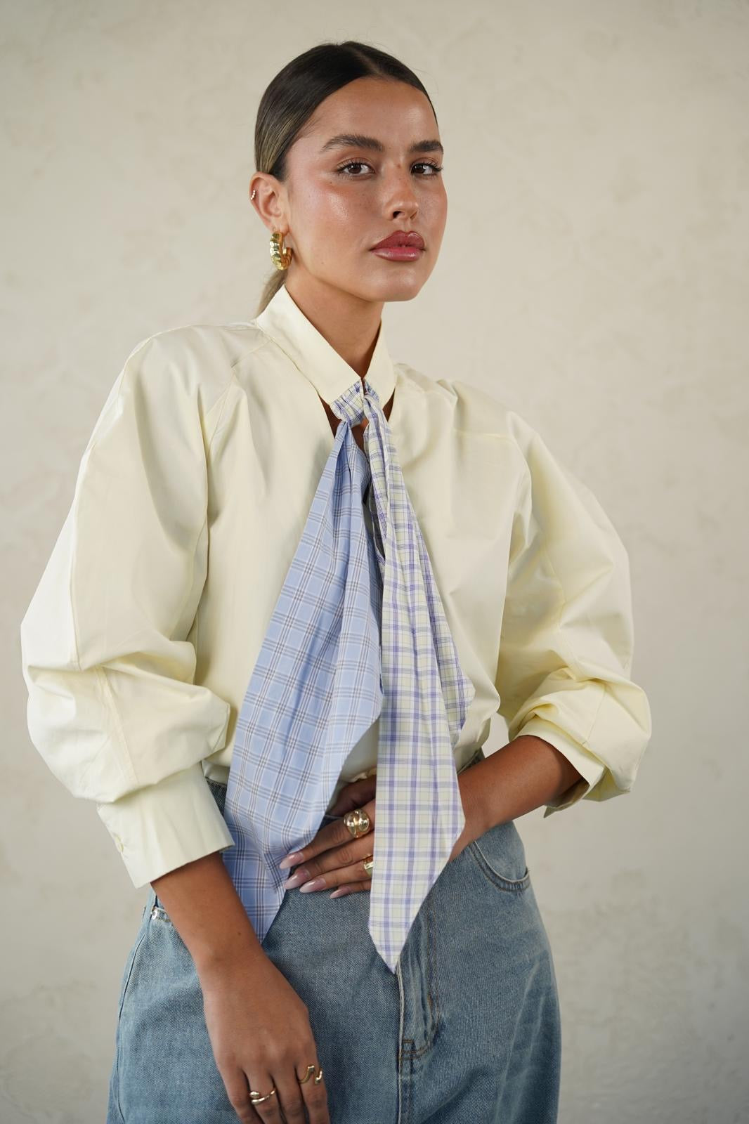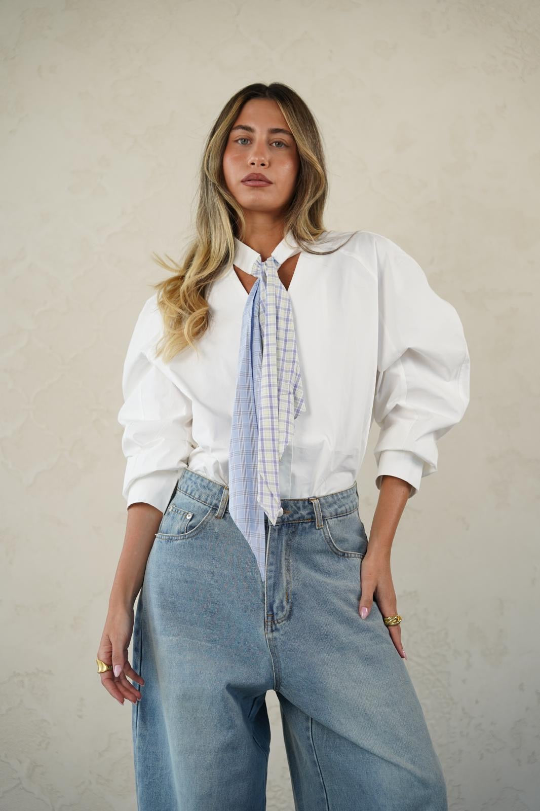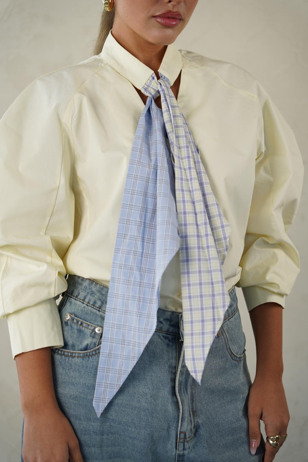 צווארון מיוחד בשילוב עניבה משובצת למראה מתוחכם ואלגנטי 💫