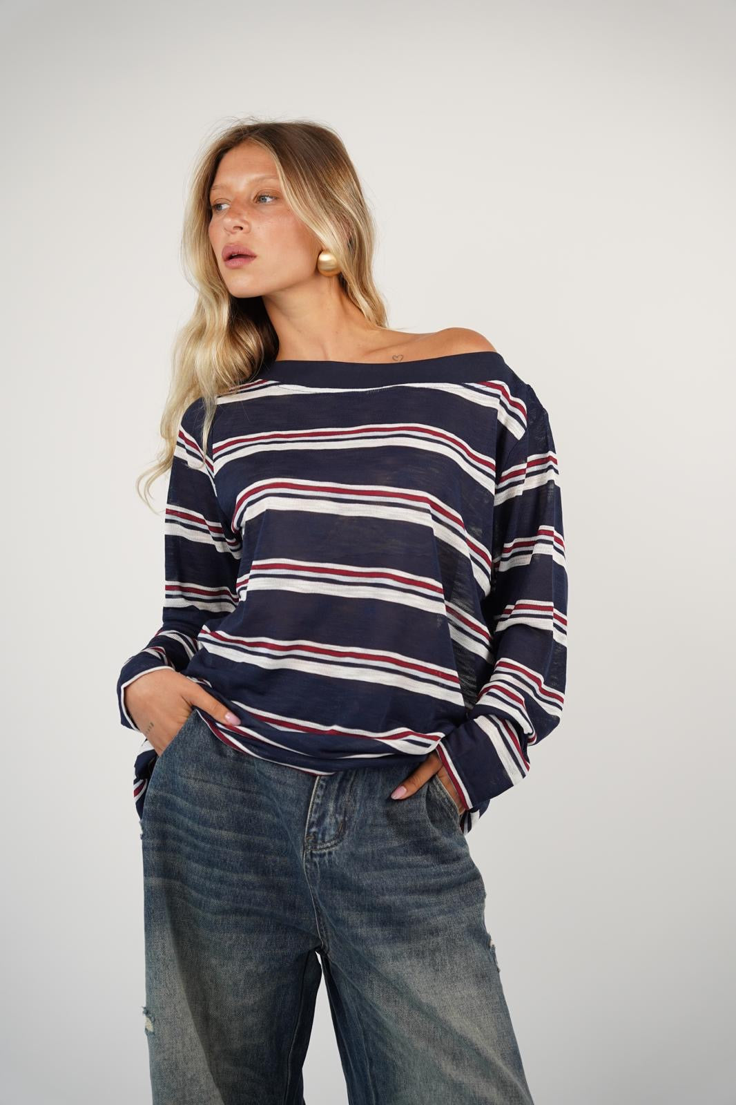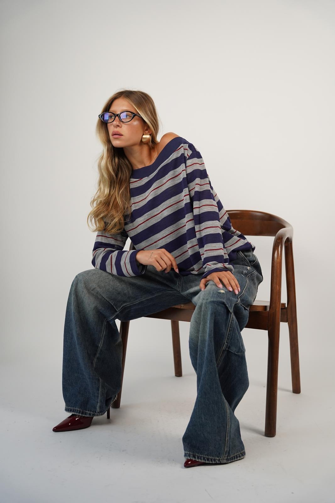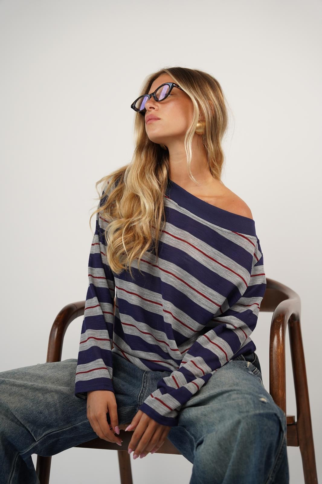 סריג ליטלסריג פסים קליל ודק עם צווארון רחב בגזרת כתף נופלת הסריג קיים בלבן פסים, כחול פסים ואפור פסיםוואן סייז