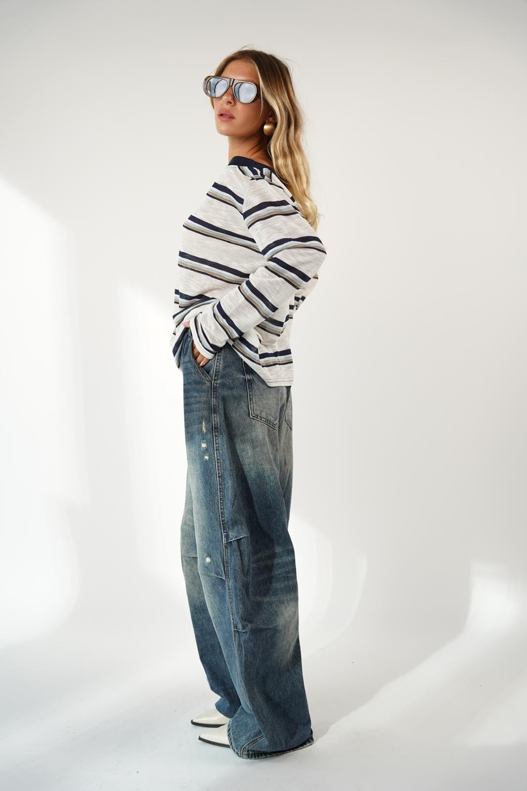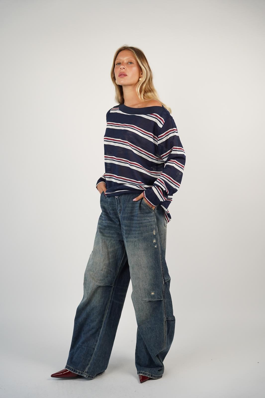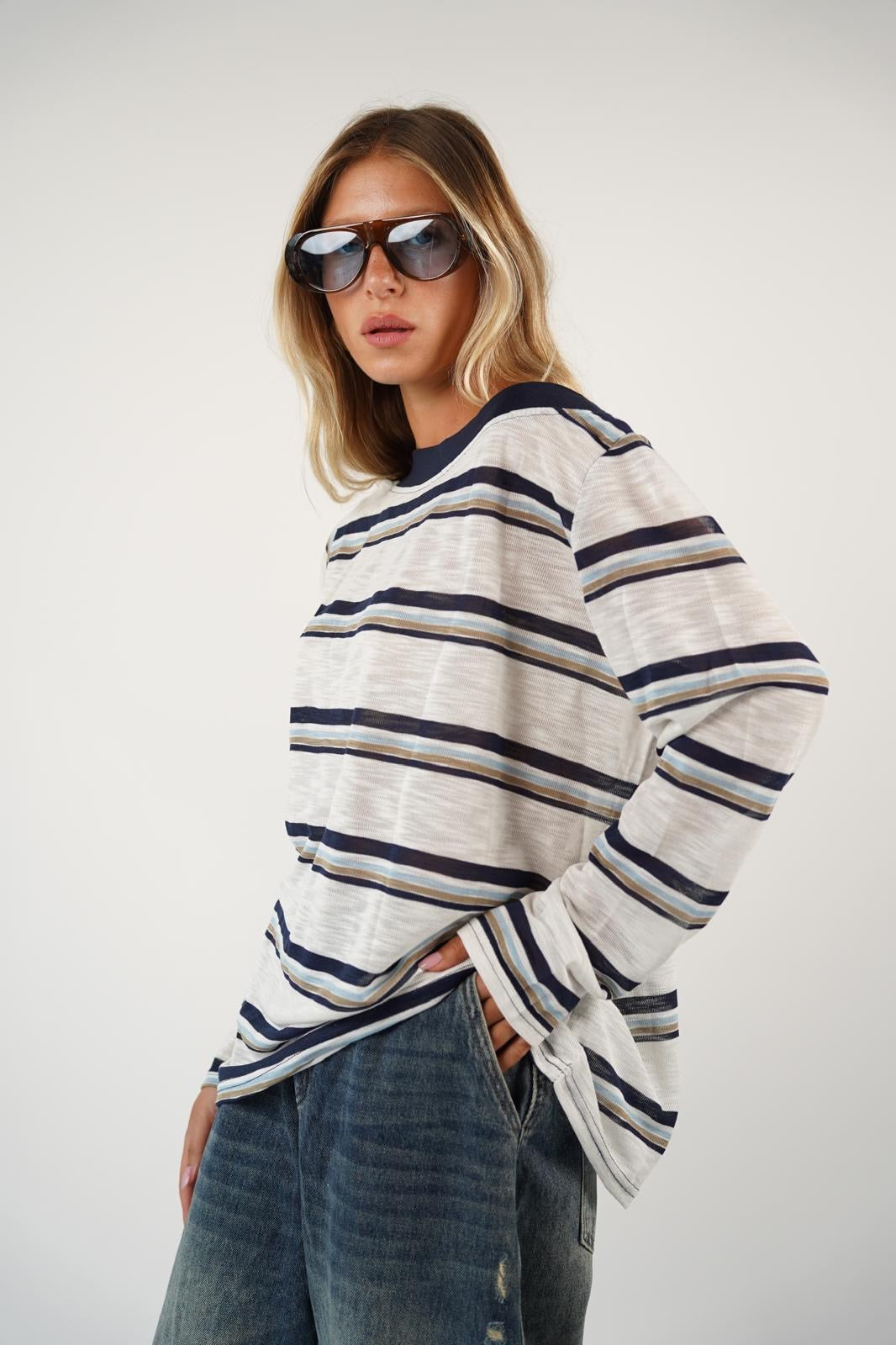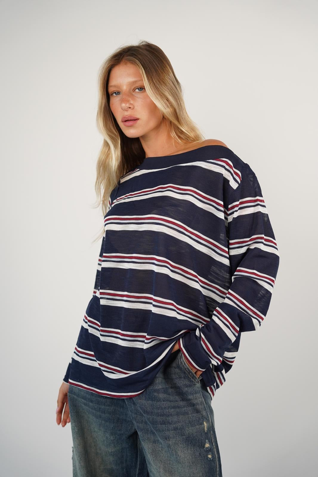 סריג ליטלסריג פסים קליל ודק עם צווארון רחב בגזרת כתף נופלת הסריג קיים בלבן פסים, כחול פסים ואפור פסיםוואן סייז