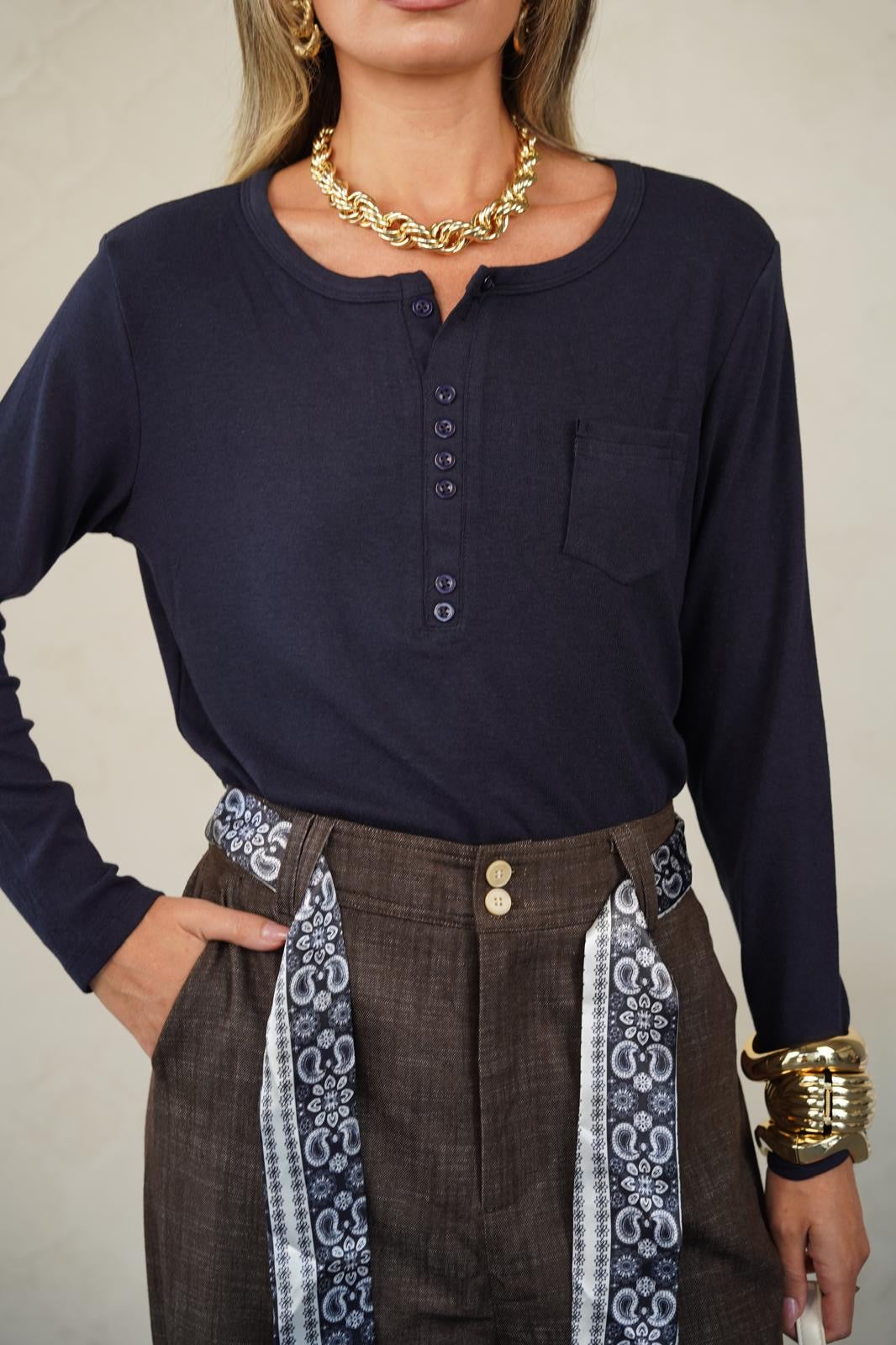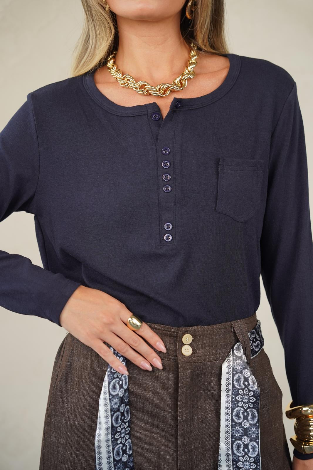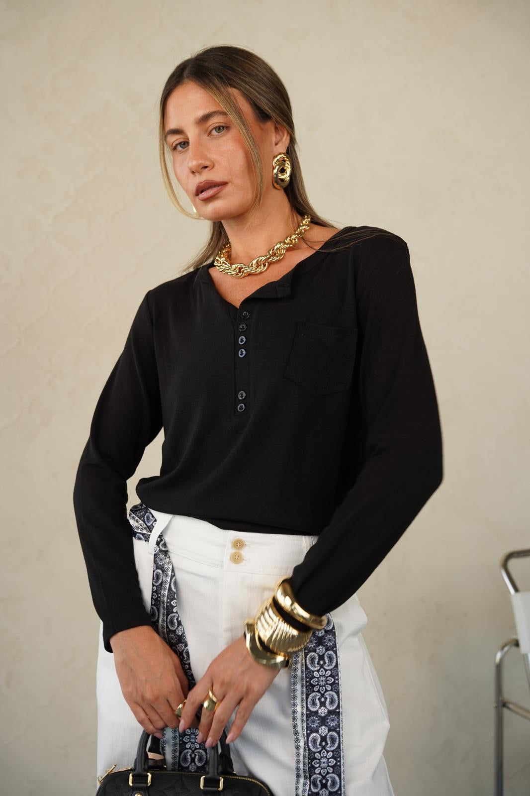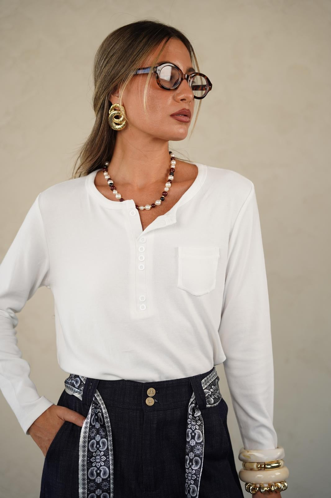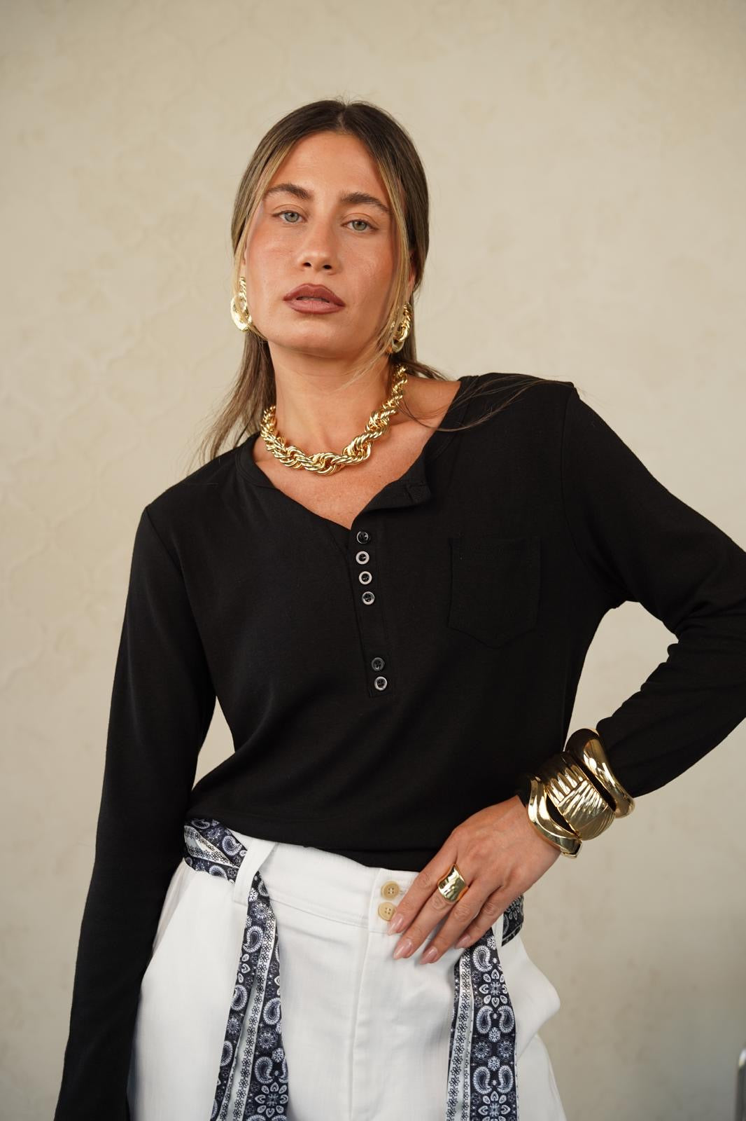 טישרט בגזרה ישרה עם מפתח עגול ו-3 כפתורים עדינים שנותנים טאץ’ נשי ומדויק 👌