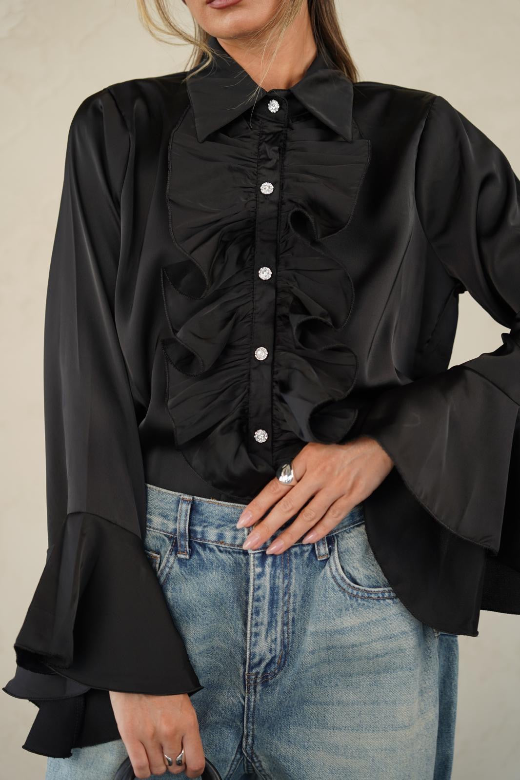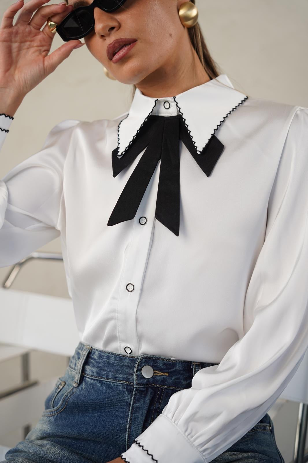 חולצה אלגנטית ומרשימה עם וולנים לנשים - דגם סלין בצבעים שחור ולבן