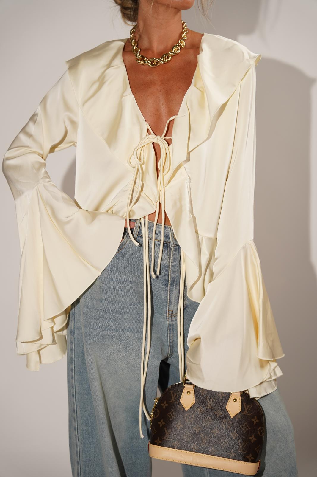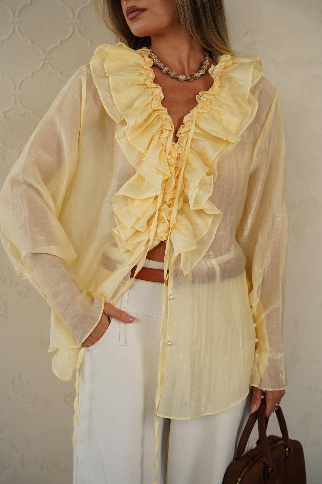 חולצה עם שרוולי פעמון לנשים - דגם איימי בצבעים צהוב זהב, לבן ושחור