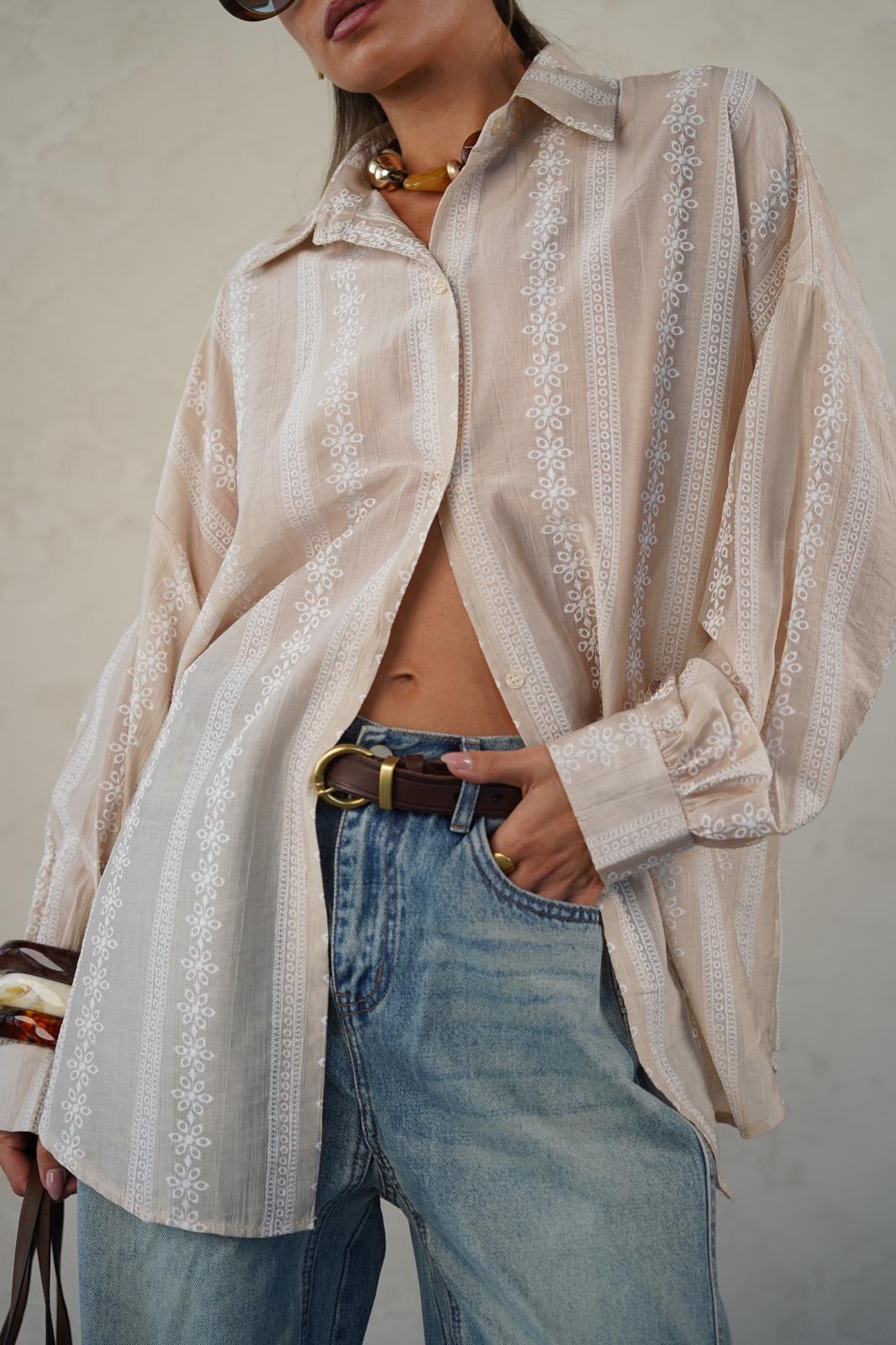 חולצה מכופתרת אוברסייז עם רקמה - דגם אלין בצבעים לבן, ורוד, קרם וירוק