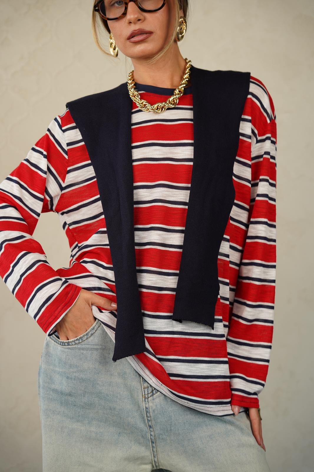 חולצת סריג דק בגזרת אוברסייז לנשים - דגם מייקל בצבעים פסים אדום ופסים כחול
