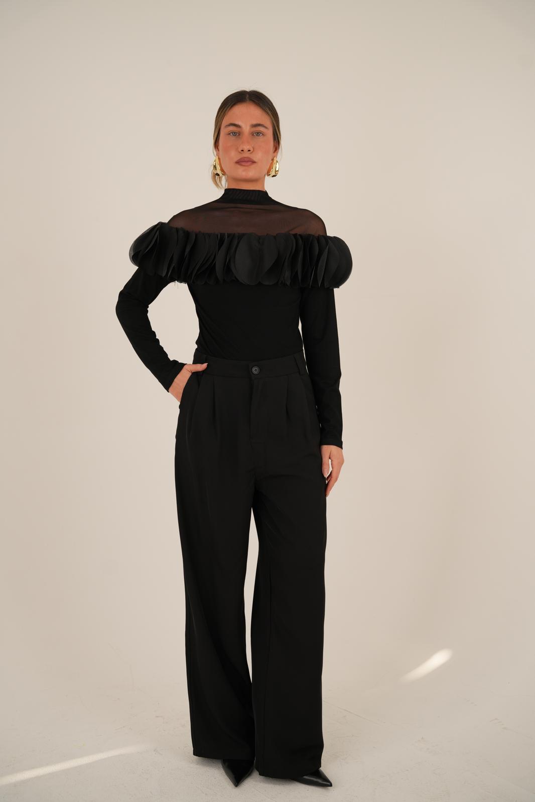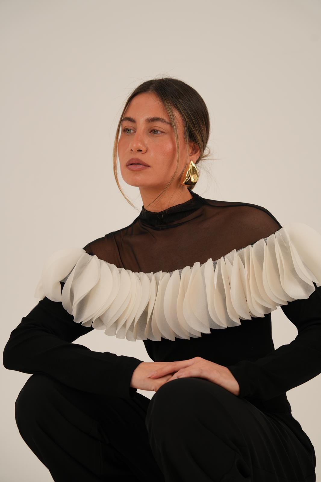 חולצה אלגנטית עם שילוב שיפון למראה עדין ומוקפד עיצוב נקי וקלאסי שמתאים גם ליום וגם לערב בד נעים ונשפך על הגוף החולצה קיימת ב- 2 צבעים, שחור ושחור עם קרם מידת וואן סייז בגזרה מחמיאה המתאימה עד מידה 38