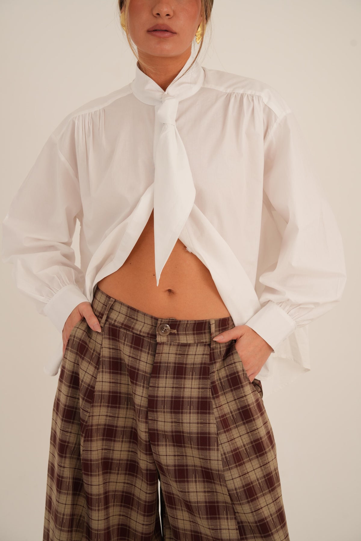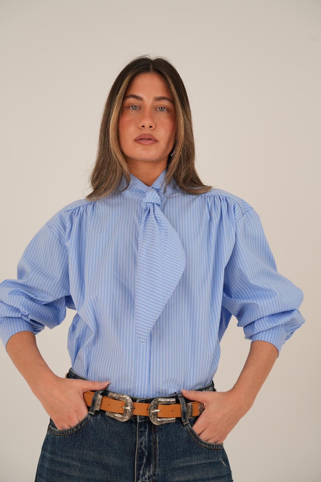חולצה מכופתרת עשירה עם עניבה מחוברת למראה אלגנטי ומוקפד גזרה מחמיאה ונשית שמתאימה ליום ולערב בד נעים ונוח ללבישה עם תחושת איכות החולצה קיימת ב- 2 צבעים, לבן ותכלת פסים וואן סייז בגזרה רחבה המתאימה עד מידה 40
