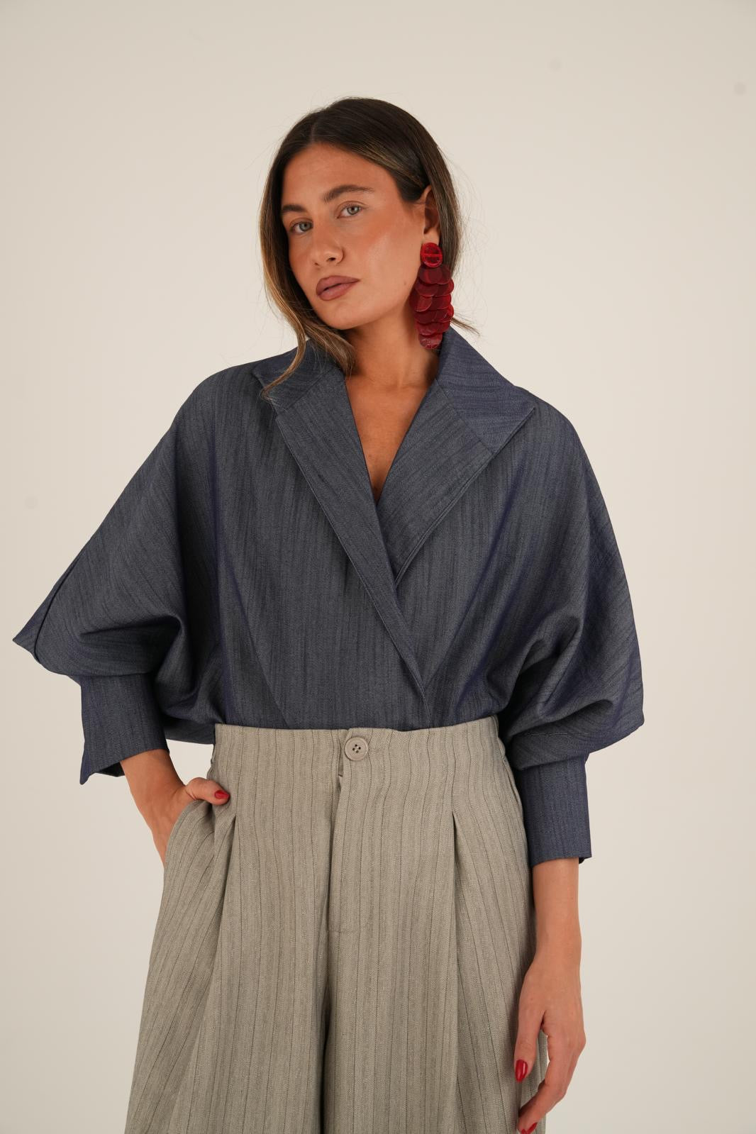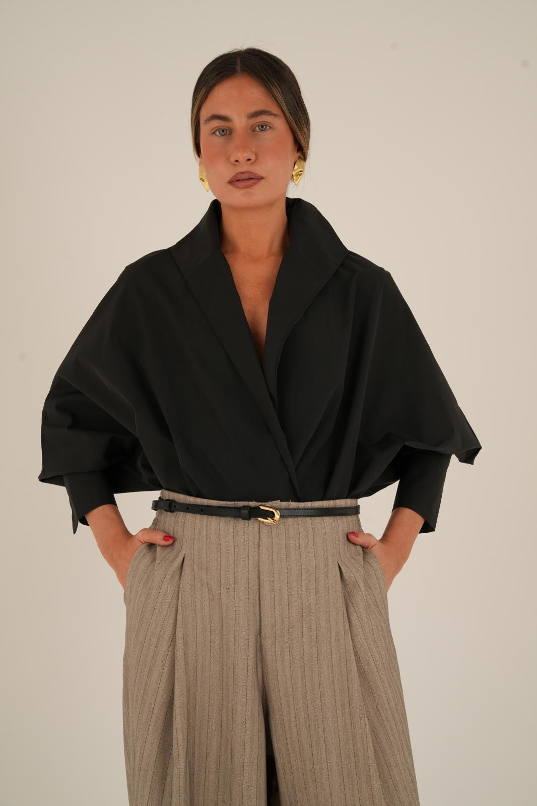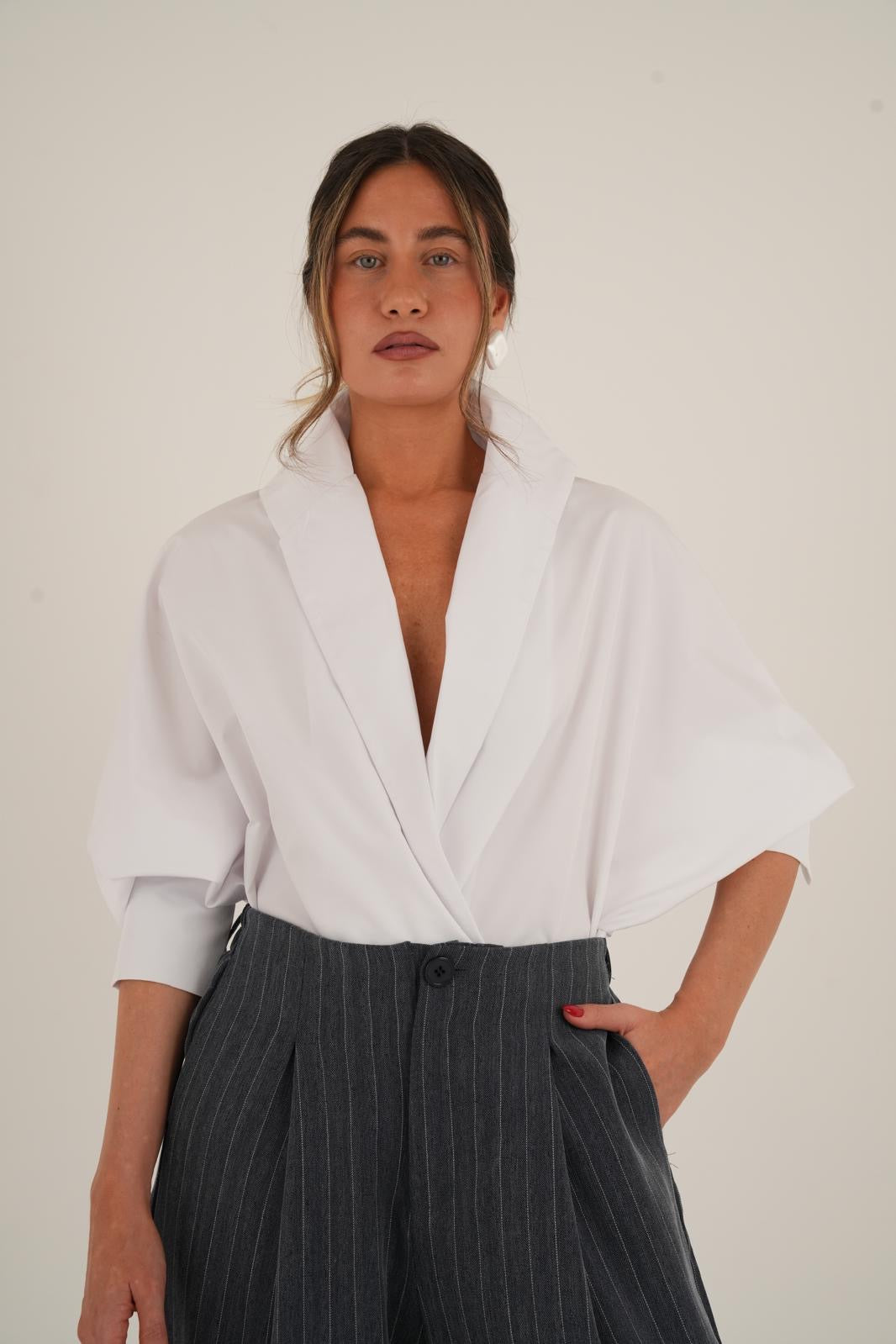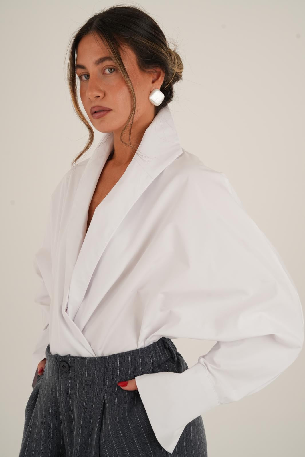 חולצה אלגנטית ועשירה עם נוכחות מרשימה צווארון גדול ושרוולים תפוחים למראה יוקרתי ומוקפד רכיסה עם כפתורים פנימיים ליצירת מראה נקי ומדויק החולצה קיימת ב- 3 צבעים, שחור, לבן וג׳ינס כהה מידת וואן סייז בגזרה מחמיאה המתאימה עד מידה 42